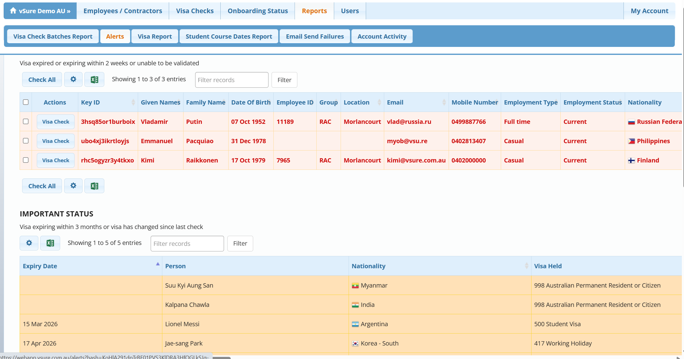 - Critical Status: individuals with expiring visas (within 2 weeks), expired visas, visas without work rights or whose status cannot validated appear here.