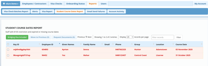 Student Course Dates Report, identifies staff with 8105 restriction who have expired or missing course dates, which helps employers manage the term dates of their student visa holders eligible to work more than 48 hours during their holidays.